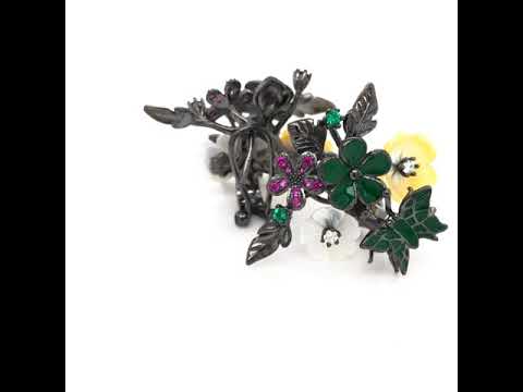 Earrings black rhodium plated with zirconia, mother of pearls, ruby, emerald and enamel